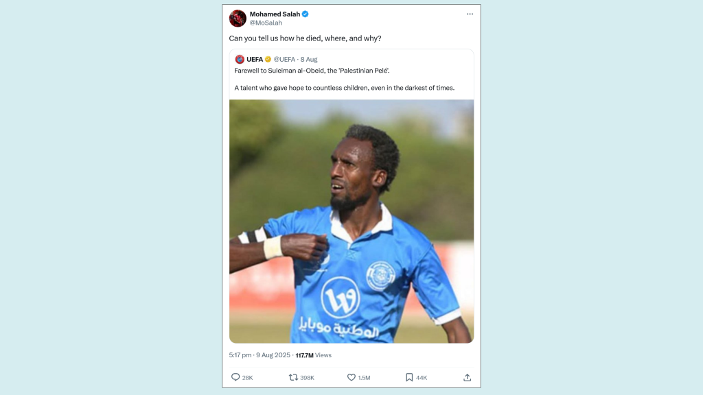 “Farewell to Suleiman al-Obeid, the ‘Palestinian Pele’,” said the UEFA account in a relatively mealy-mouthed post on X. “A talent who gave hope to countless children, even in the darkest of times.”
